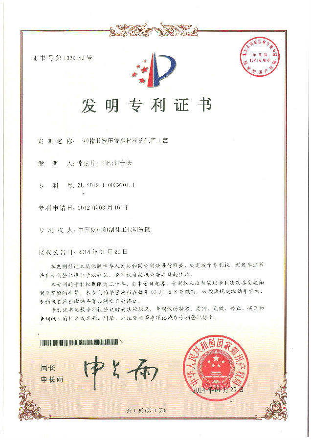 日前,我院最新一件發(fā)明專利獲得授權(quán)。專利名稱:一種橡膠模壓發(fā)泡材料的生產(chǎn)工藝,專利號:ZL 2012 1 0069701.1。發(fā)明人:王旭、鐘寧慶,專利權(quán)人:中國皮革和制鞋工業(yè)研究院。