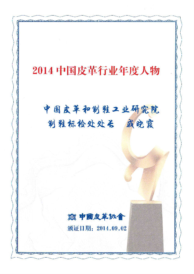 2014年9月2日,中國(guó)皮革協(xié)會(huì)七屆四次理事會(huì)擴(kuò)大會(huì)議在上海召開。會(huì)上,由中國(guó)皮革協(xié)會(huì)副理事長(zhǎng)、廣東省皮革協(xié)會(huì)執(zhí)行會(huì)長(zhǎng)王建新主持的首屆中國(guó)皮革行業(yè)年度人物頒獎(jiǎng)典禮隆重舉行。我院制鞋標(biāo)準(zhǔn)檢測(cè)處處長(zhǎng)戚曉霞榮獲“鞋類標(biāo)準(zhǔn)國(guó)際化的開拓者”獎(jiǎng)。