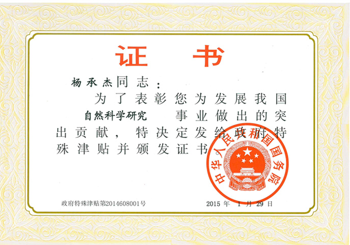 為了表彰我院院長楊承杰同志在自然科學(xué)研究事業(yè)做出的突出貢獻(xiàn),經(jīng)中輕集團(tuán)公司推薦,國務(wù)院批準(zhǔn)楊承杰同志享受2014年政府特殊津貼。