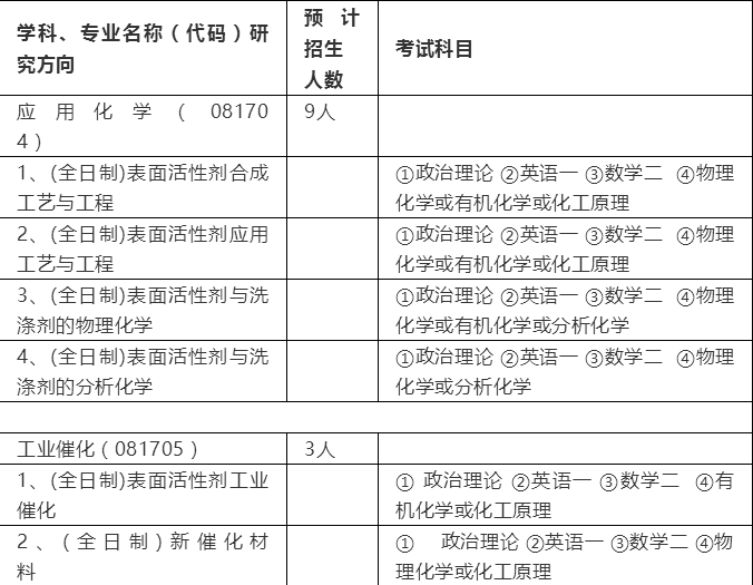 2020年面向全國招生,招生專業(yè)為:應(yīng)用化學(xué)和工業(yè)催化,均為全日制。凡符合國家研究生招生簡章規(guī)定報考條件的考生,均可報考我院。被我院錄取的研究生,在攻讀學(xué)位期間可以享受我院提供的助學(xué)金,學(xué)習(xí)成績優(yōu)秀的碩士研究生可以獲得各類獎學(xué)金。一年級在山東大學(xué)膠體與界面化學(xué)教育部重點實驗室學(xué)習(xí)基礎(chǔ)理論課,二、三年級在日化院完成學(xué)位論文,其間在受到嚴格科研訓(xùn)練的同時,還能參與到我院承擔(dān)的國家和地方各類研究項目中。畢業(yè)后面向全國就業(yè),成績優(yōu)秀者可留院工作。我院歷屆畢業(yè)碩士研究生受到了全國日化及表面活性劑相關(guān)行業(yè)的歡迎,也得到其他與化學(xué)化工相關(guān)企業(yè)、科研院所及高等院校的高度認可。