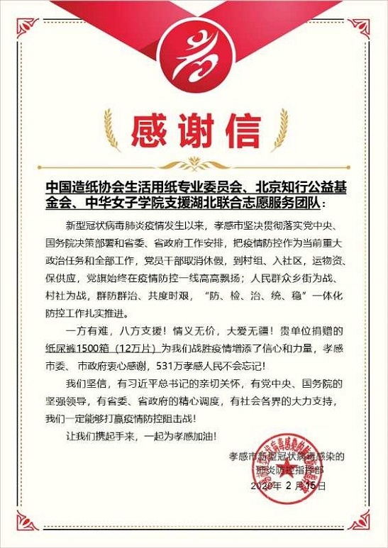 災(zāi)難無情,行業(yè)有愛!中國制漿造紙研究院有限公司、中國造紙協(xié)會(huì)生活用紙專業(yè)委員會(huì)以及衛(wèi)品行業(yè)的企業(yè)家和科技工作者用實(shí)際行動(dòng)踐行社會(huì)責(zé)任,齊心協(xié)力馳援湖北、共克時(shí)艱,為打贏這場疫情防控阻擊戰(zhàn)貢獻(xiàn)力量。
