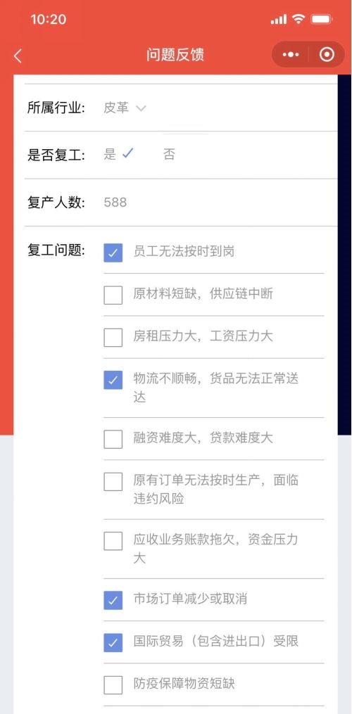 企業(yè)可以一鍵反饋復工時遇到的問題,問題覆蓋員工到崗、融資問題、供應鏈問題、物流問題等10個方面。