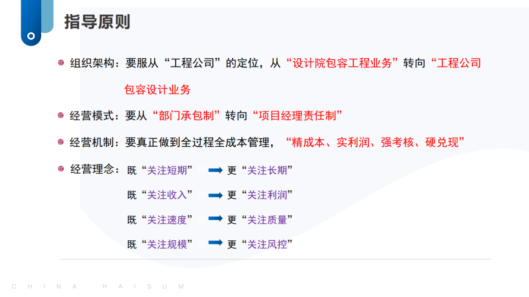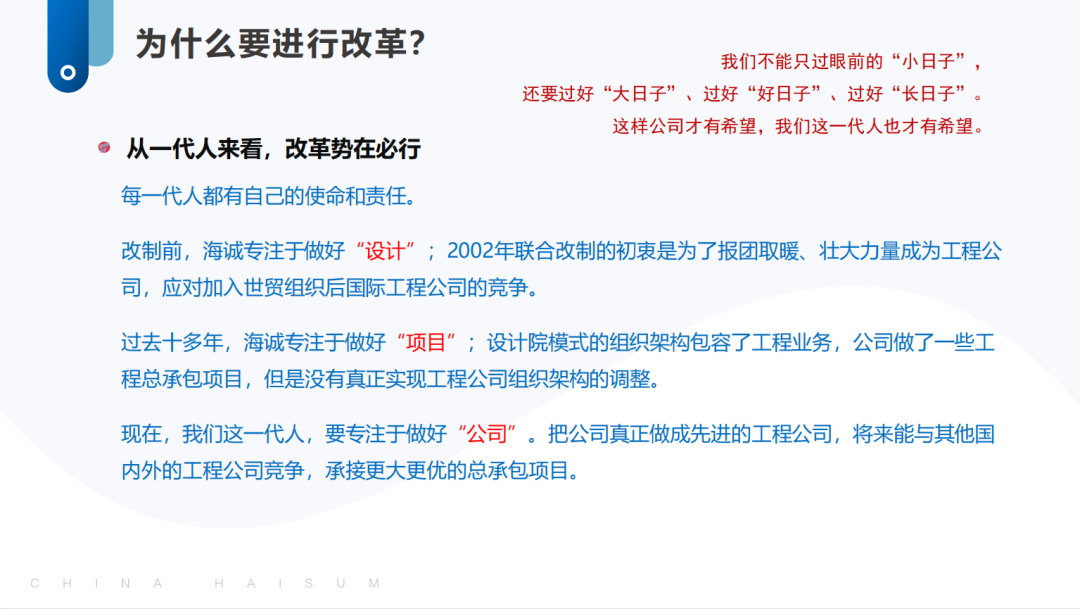 二是要進(jìn)一步提高認(rèn)識,上下一心形成改革合力和發(fā)展動力。各級領(lǐng)導(dǎo)干部要進(jìn)一步提高認(rèn)識,統(tǒng)一思想,融入改革,按照新的組織體系,凝心聚力推進(jìn)公司生產(chǎn)經(jīng)營工作。海誠總部要著力抓好統(tǒng)一管理和技術(shù)標(biāo)準(zhǔn)、搭建業(yè)務(wù)支持平臺、協(xié)調(diào)配置內(nèi)外部資源、優(yōu)化完善考核分配機(jī)制等平臺性基礎(chǔ)性工作。各子公司、各業(yè)務(wù)單位要進(jìn)一步提高站位,樹立一盤棋思想,積極支持參與配合海誠總部平臺建設(shè),主動承載落實(shí)海誠股份總體戰(zhàn)略。