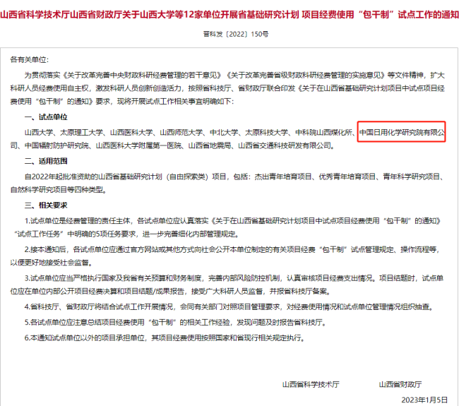 中國日用化學(xué)研究院獲批成為山西省基礎(chǔ)研究計劃項(xiàng)目經(jīng)費(fèi)使用“包干制”試點(diǎn)單位 。中國日用化學(xué)研究院將以此為契機(jī),加大科研投入,激發(fā)科研人員創(chuàng)造活力,不斷提升創(chuàng)新能力。