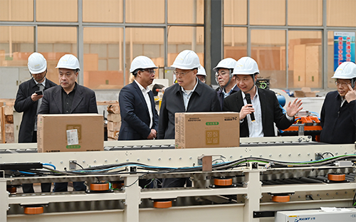 張劍飛一行深入生產(chǎn)車間,實地考察企業(yè)生產(chǎn)經(jīng)營情況。屈輝現(xiàn)詳細(xì)匯報企業(yè)發(fā)展歷程、主營業(yè)務(wù)、創(chuàng)新研發(fā)成果、核心競爭力及未來發(fā)展規(guī)劃,并現(xiàn)場演示紙箱件智能裝車系統(tǒng)測試運(yùn)行。