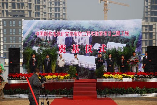 2012年10月12日,俞海星總經理出席了中國制漿造紙研究院廊坊工程實驗室項目二期工程開工奠基儀式。俞總在致辭中對造紙院廊坊項目建設工作給予了充分肯定,對長期以來關心和支持中輕集團發(fā)展,特別是關心和支持該項目籌備實施的廊坊市各級領導和部門表示了感謝,并向為工程開工付出辛勤勞動的一線干部職工表示了慰問。他希望項目承建單位要切實增強緊迫感和責任感,嚴格工程管理,確保安全、質量和進度,力爭把項目建設成為廊坊科技谷的標志性、樣板性工程。中國制漿造紙研究院院長曹春昱和廊坊科技谷有關領導也分別在儀式上致辭。